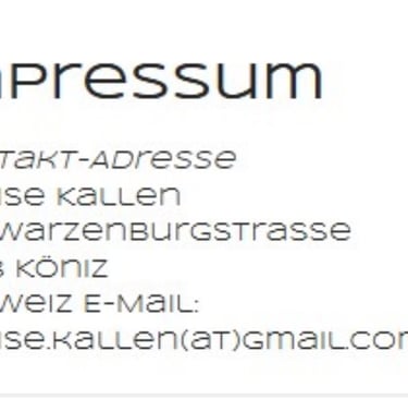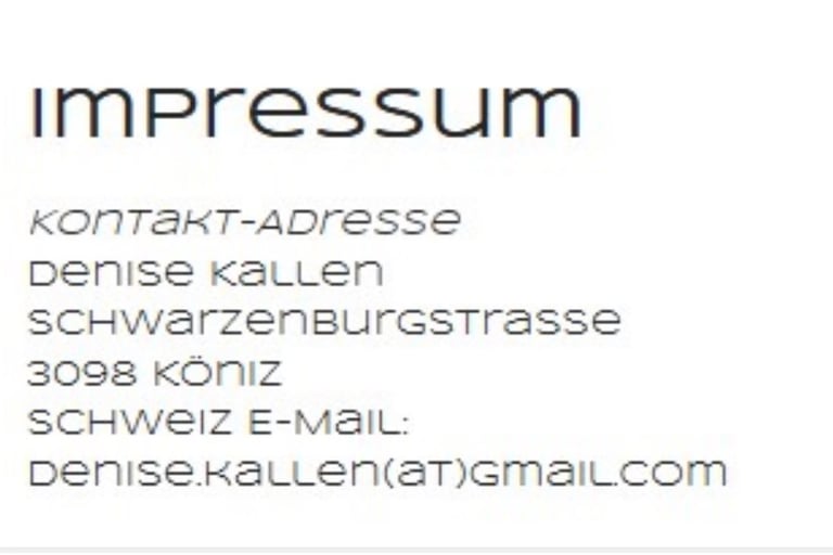 UrheberrechteDie Urheber- und alle anderen Rechte an Inhalten, Bildern, Fotos oder anderen Dateien auf dieser Website, gehören ausschliesslich Denise Kallen oder den speziell genannten Rechteinhabern. Für die Reproduktion jeglicher Elemente ist die schriftliche Zustimmung des Urheberrechtsträgers im Voraus einzuholen.